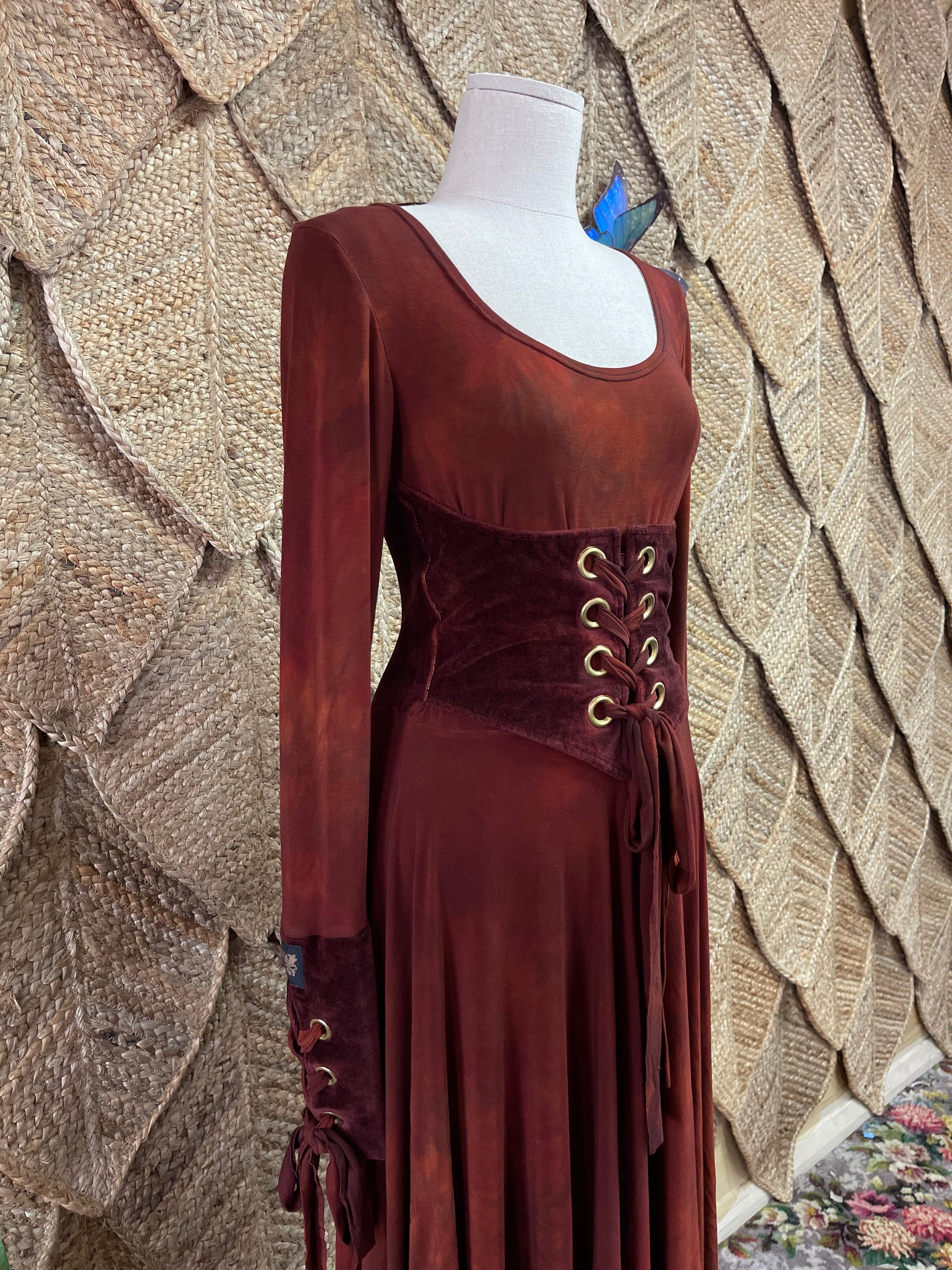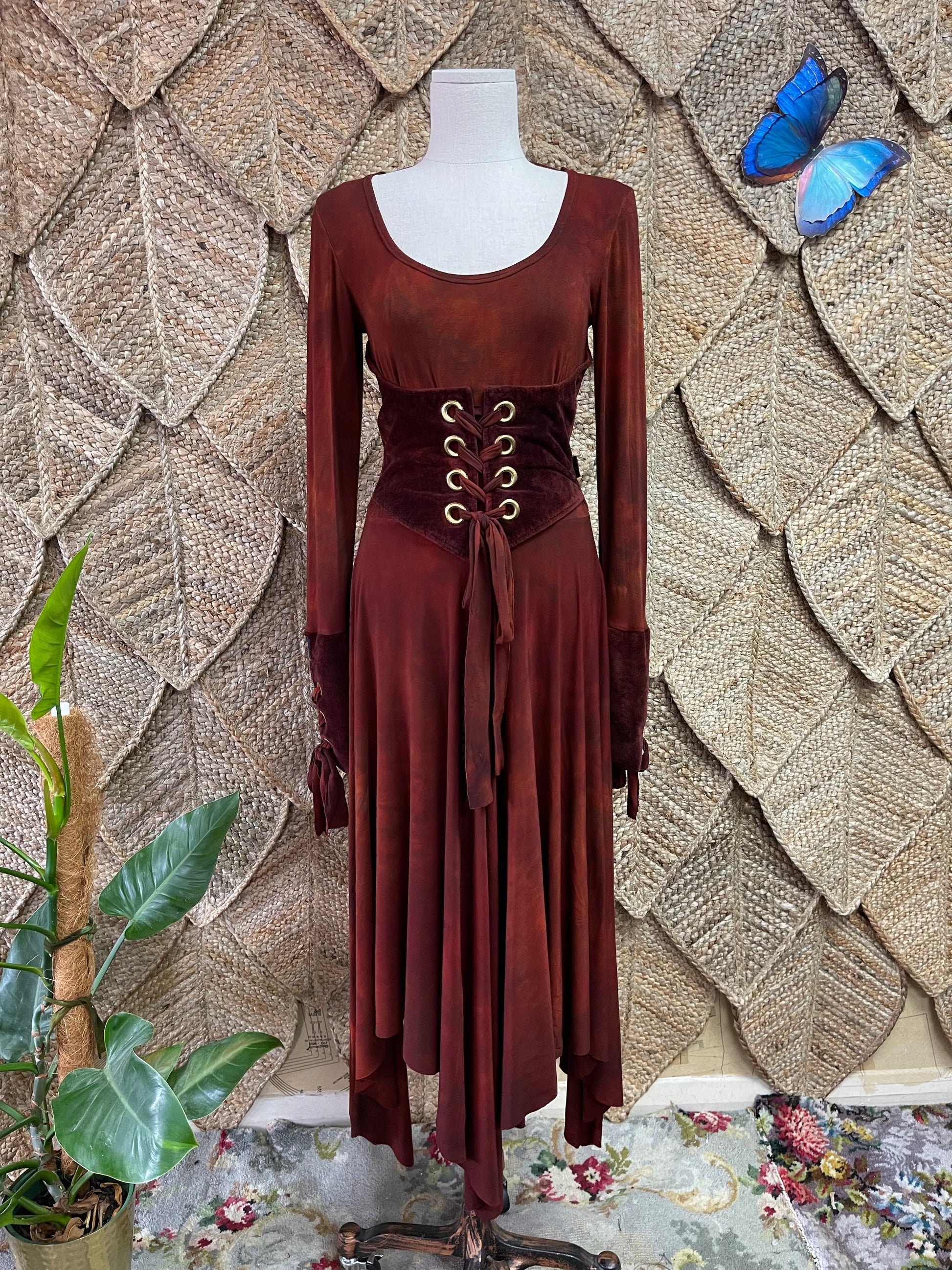 Handmade of hand dyed Bamboo stretch & velour. Featuring a ‘corset’ detail that can be worn front or back, as can the dress. Velour cuffs with lacing detail. Your dress, your way.
