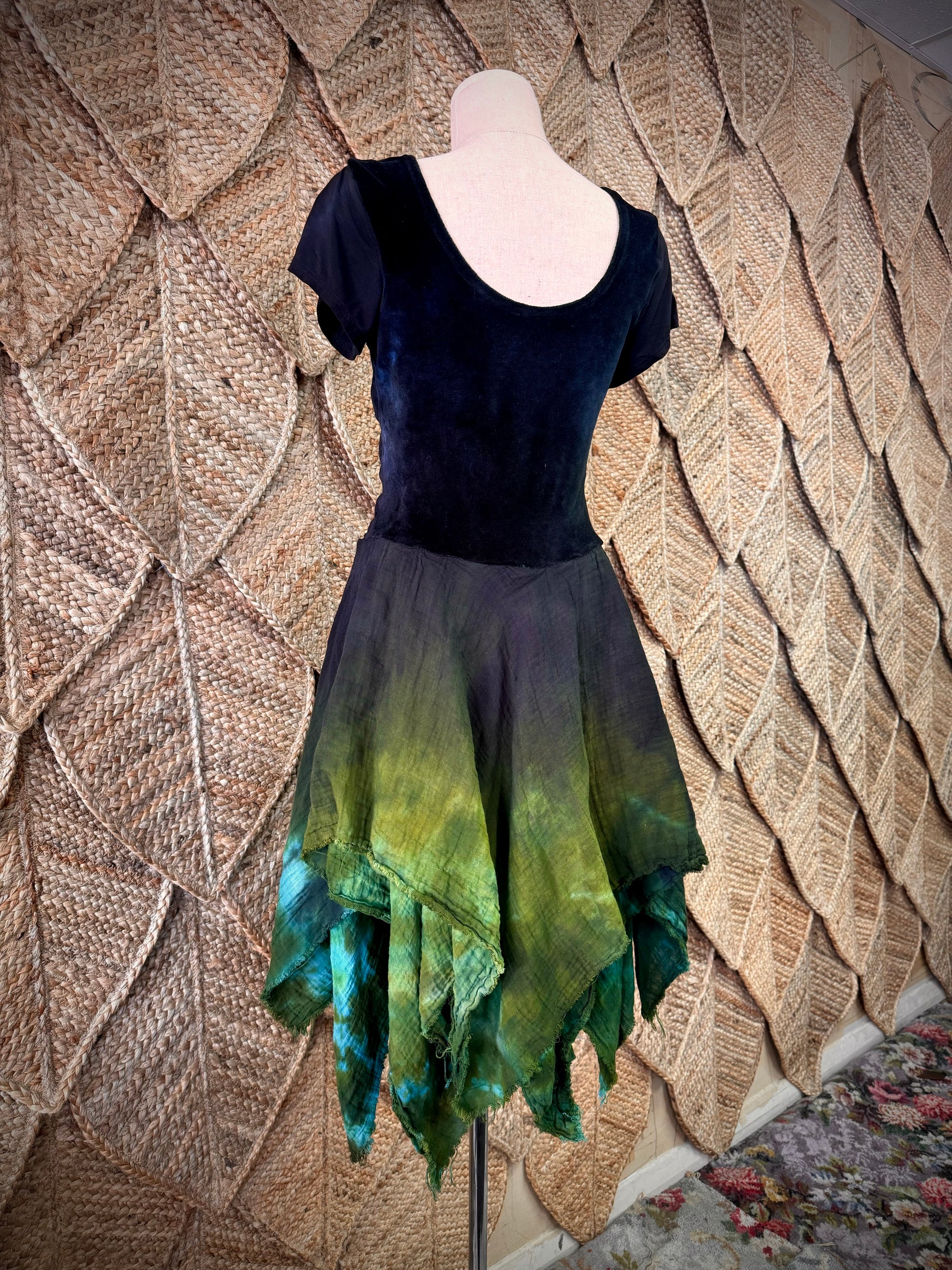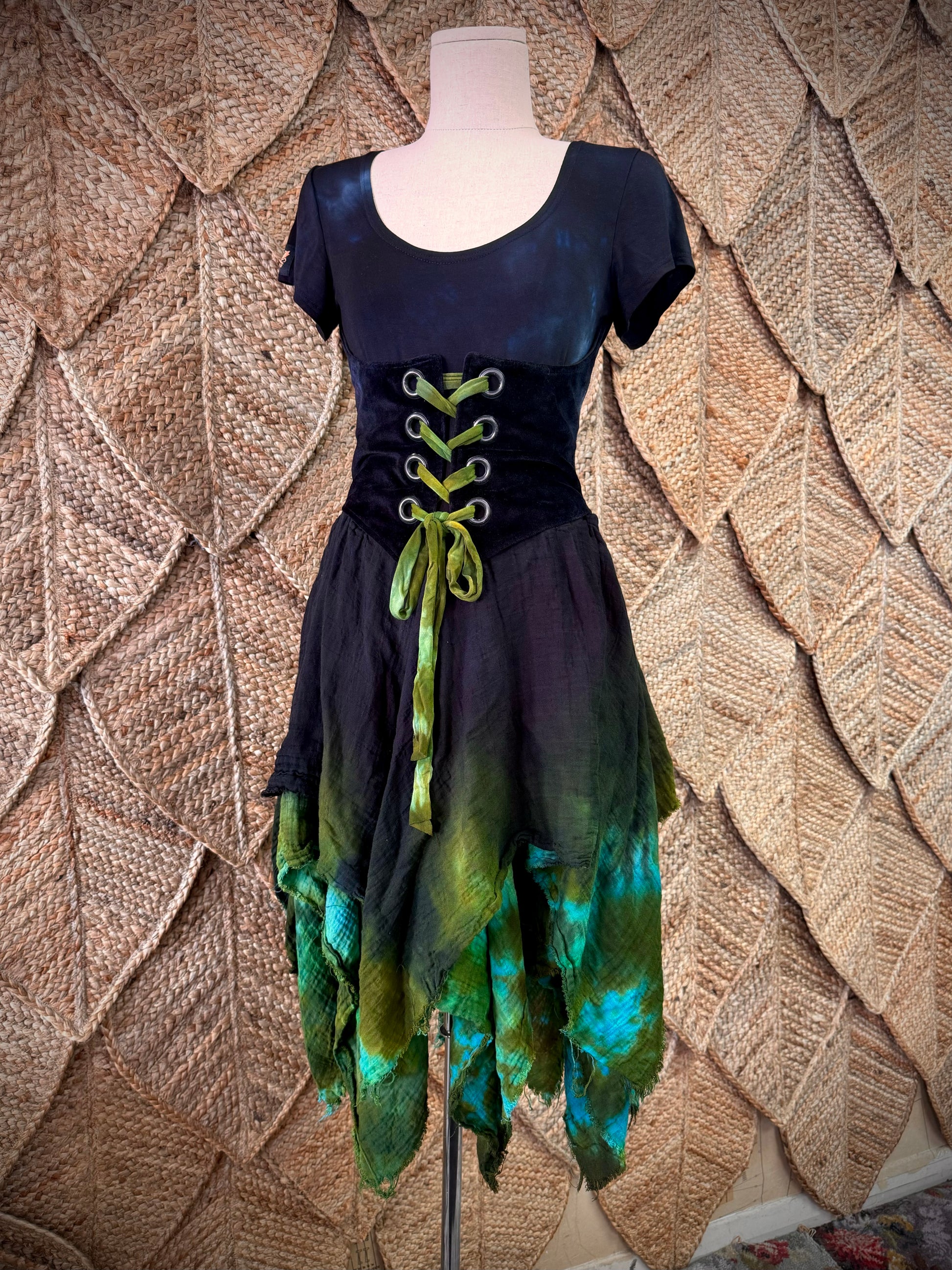 Handmade of hand dyed Bamboo stretch & velour. Featuring a ‘corset’ detail that can be worn front or back, as can the dress. Textured & layered Pixie Style Skirt