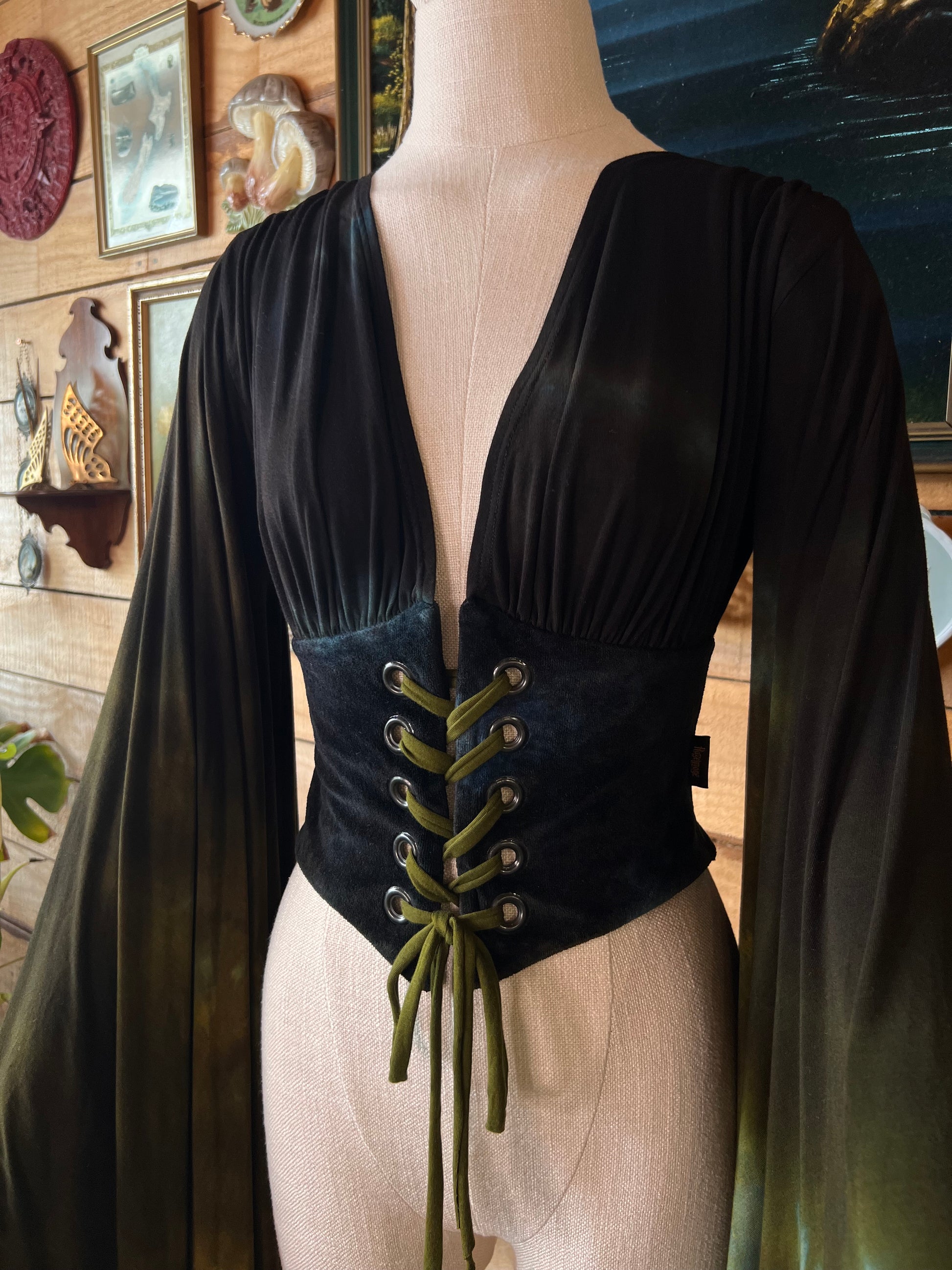 Handmade, Handdyed Bamboo Velour & flowy knit featuring witchy sleeves & handpressed eyelets.