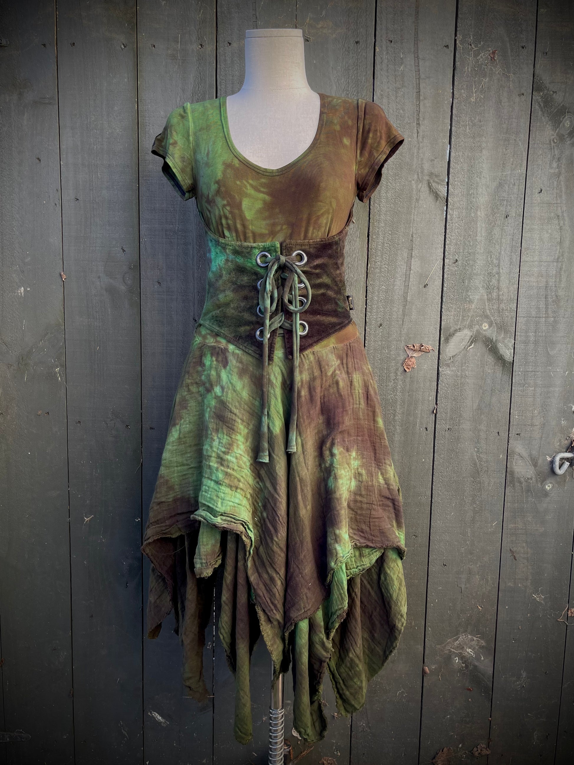 Handmade of hand dyed Bamboo stretch & velour. Featuring a ‘corset’ detail that can be worn front or back, as can the dress. Textured & layered Pixie Style Skirt