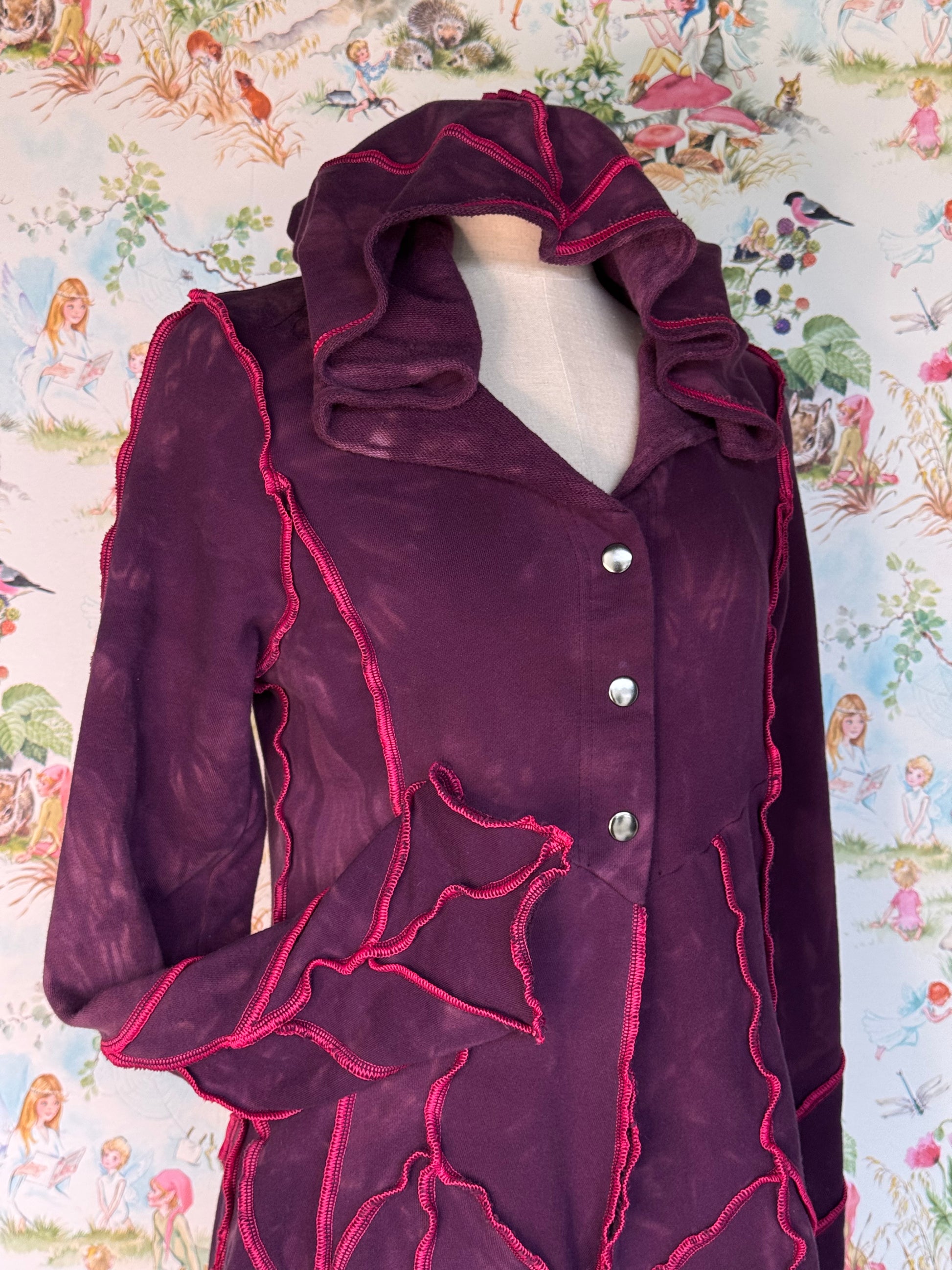 Handdyed Organic Cotton Terry Pixie Cardi featuring Leafae seaming, contrast stitch & antiqued snaps.
