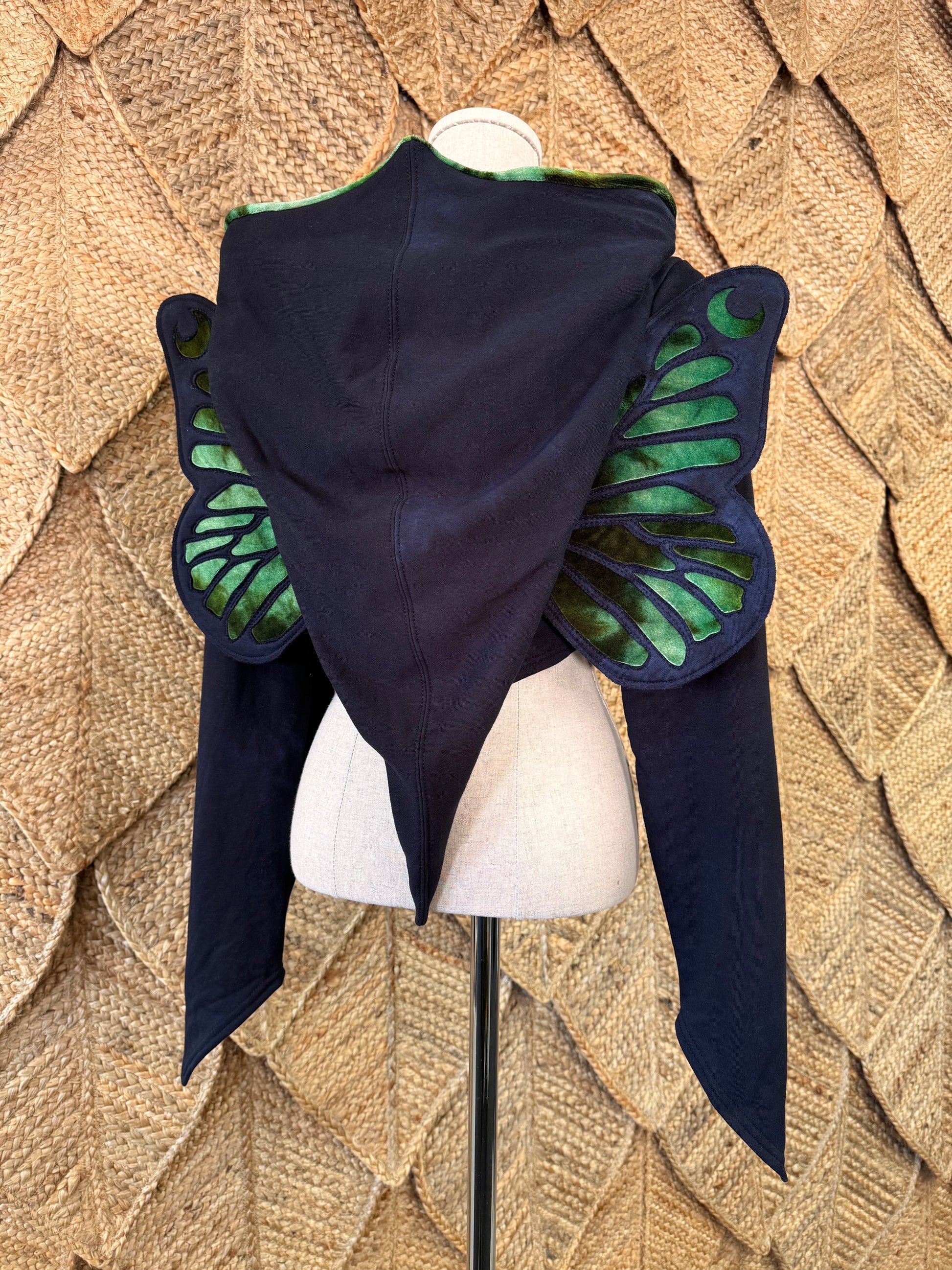 Handmade Faewing Shrug made with Handdyed Bamboo Fleece & Bamboo Velour lining. Featuring new hood shape, applique wings & oversized eyelets.