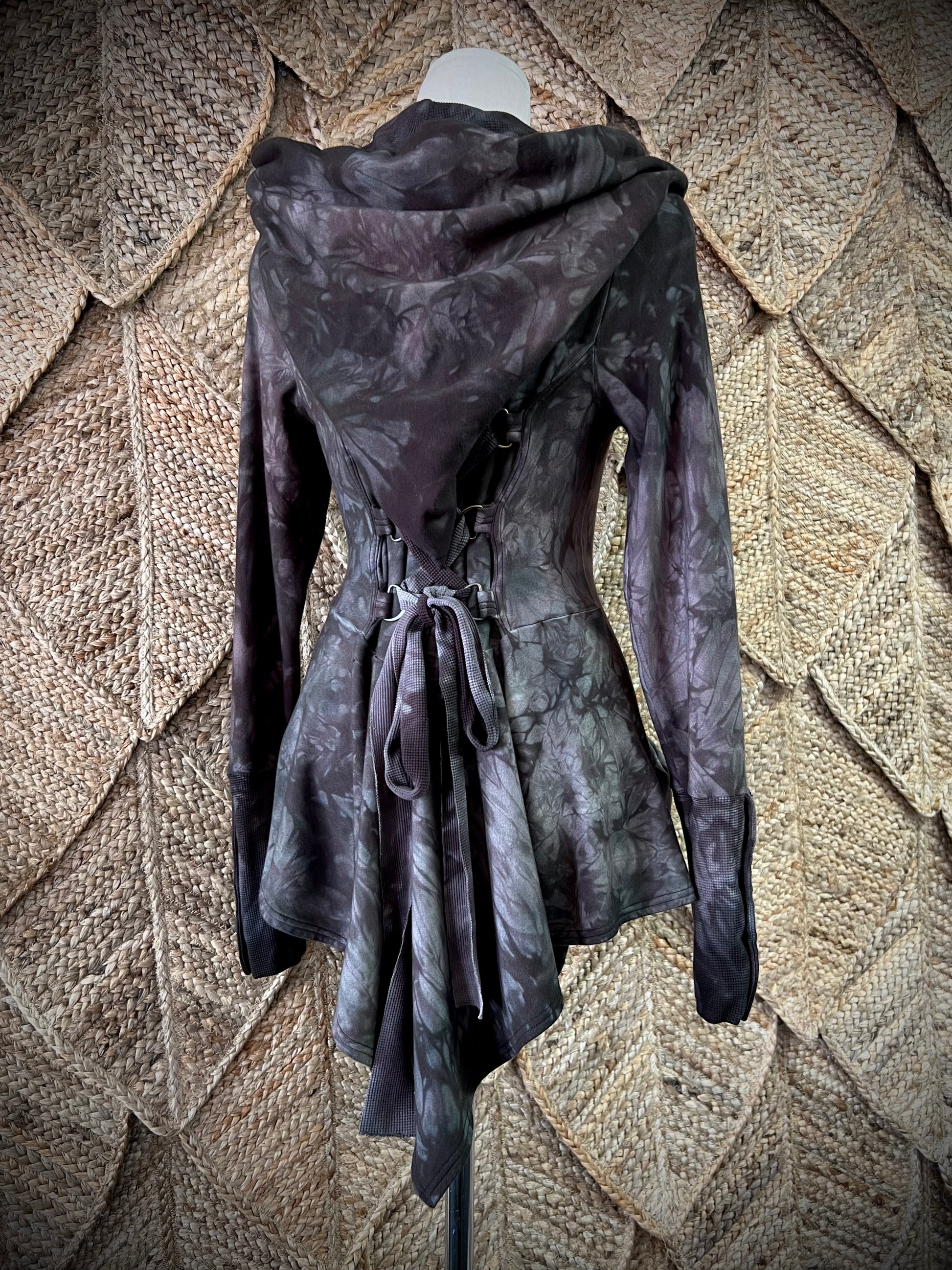 Handdyed Bamboo Stretch Fleece & Waffle Pixie Coat with Dome closing cuffs & front. Featuring lined hood, a lace up back & big pockets fit for Magic Chasing