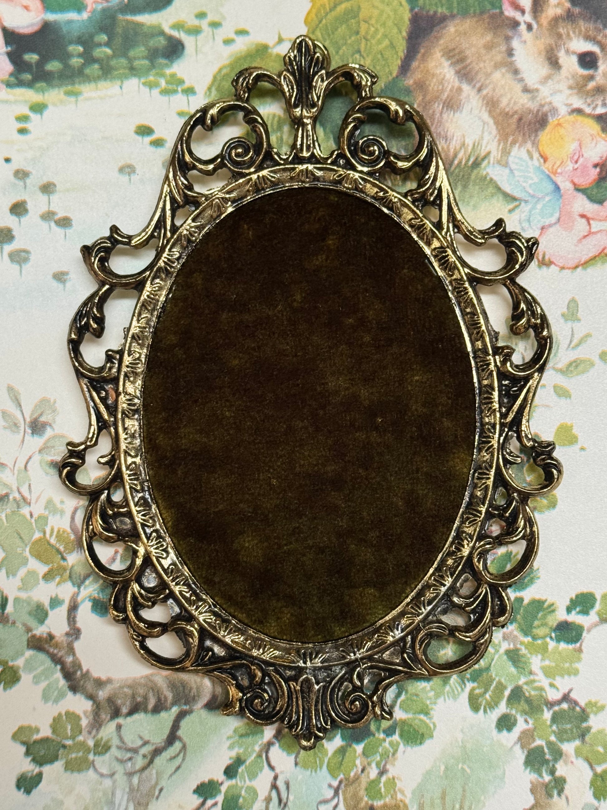 At last! A magic place to store & display your gorgeous embroidered brooches! Handcrafted with an antique brass frame with a portal of layered velour, foam & a secret layer of structured wonder, you can pin one or many brooches between wears.