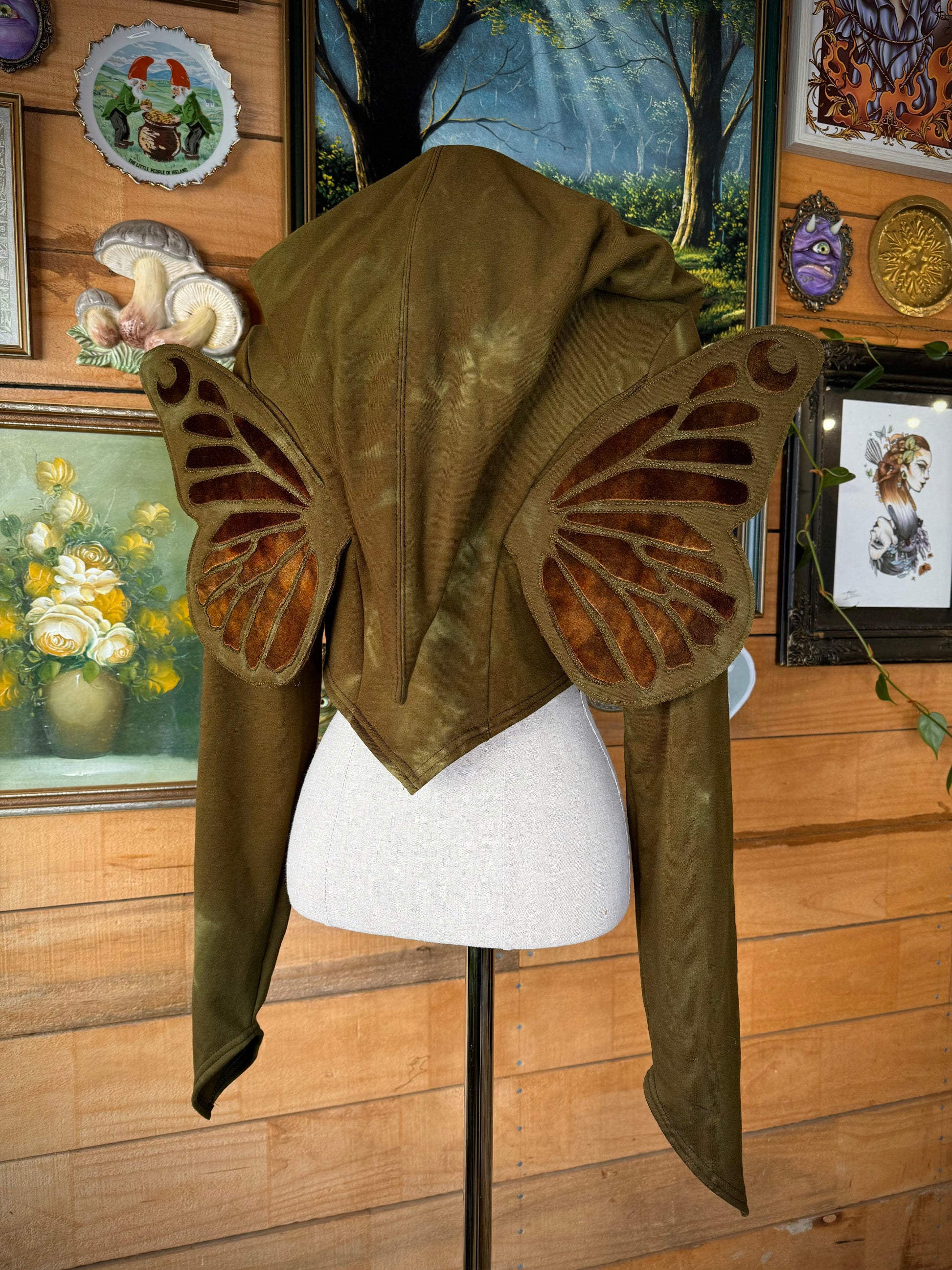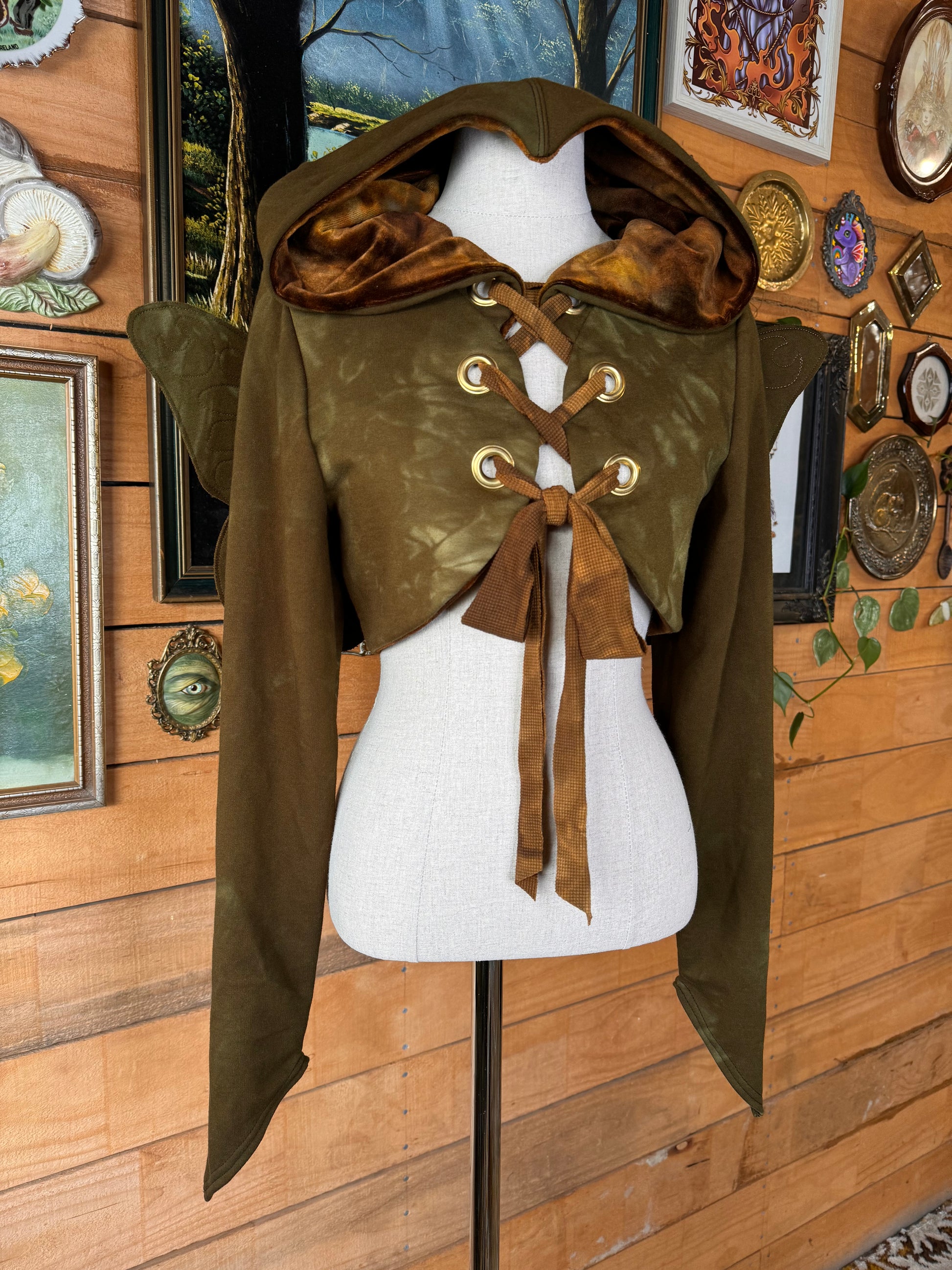 Handmade Faewing Shrug made with Handdyed Bamboo Fleece & Bamboo Velour lining. Featuring new hood shape, applique wings & oversized eyelets.
