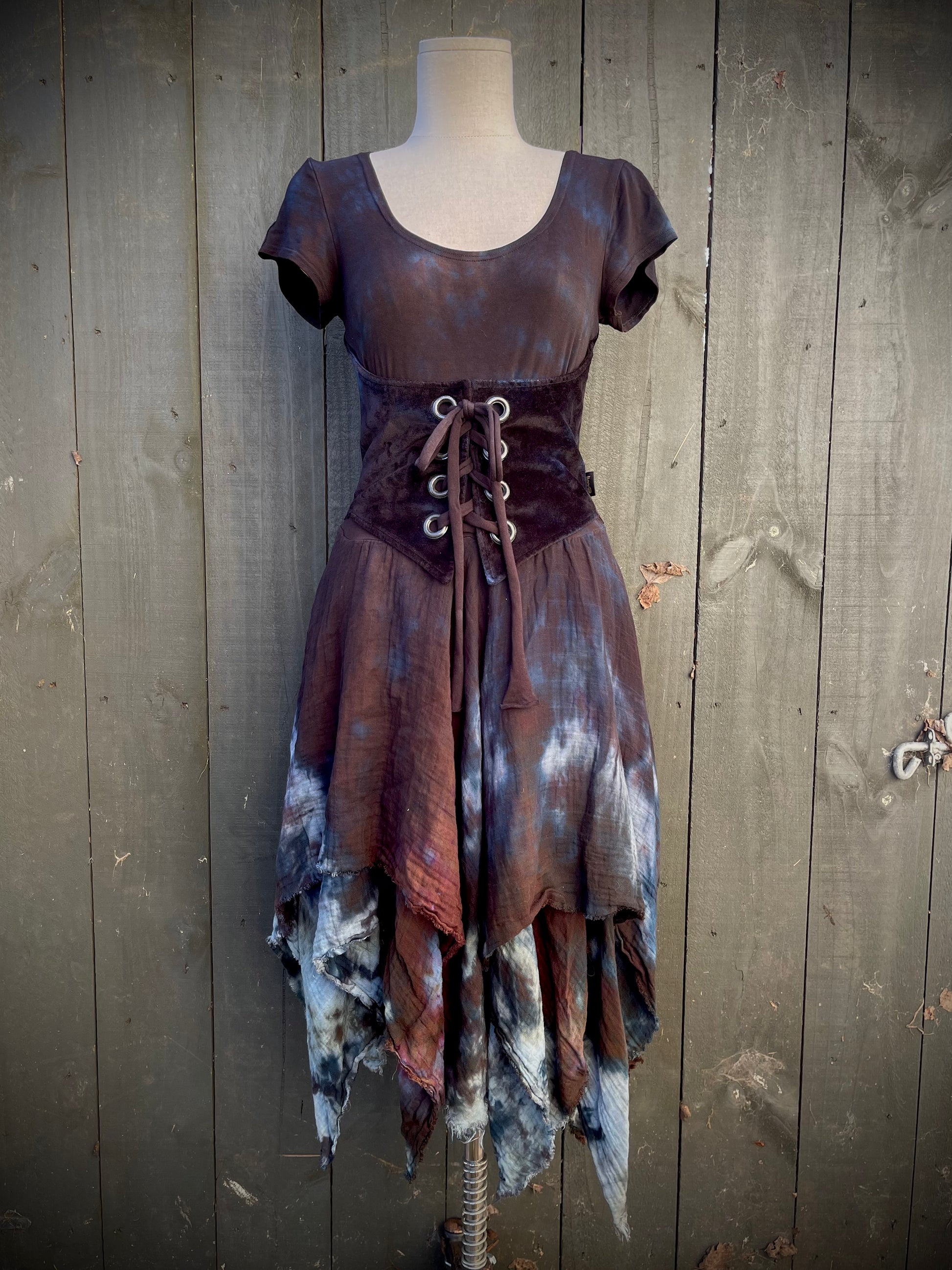 Handmade of hand dyed Bamboo stretch & velour. Featuring a ‘corset’ detail that can be worn front or back, as can the dress. Textured & layered Pixie Style Skirt
