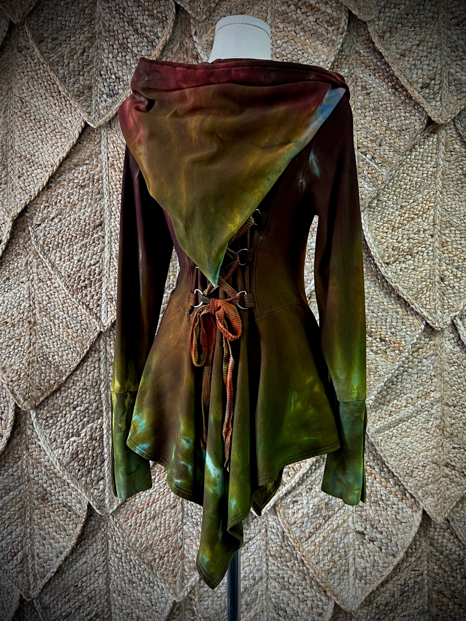 Handdyed Bamboo Stretch Fleece & Waffle Pixie Coat with Dome closing cuffs & front. Featuring lined hood, a lace up back & big pockets fit for Magic Chasing