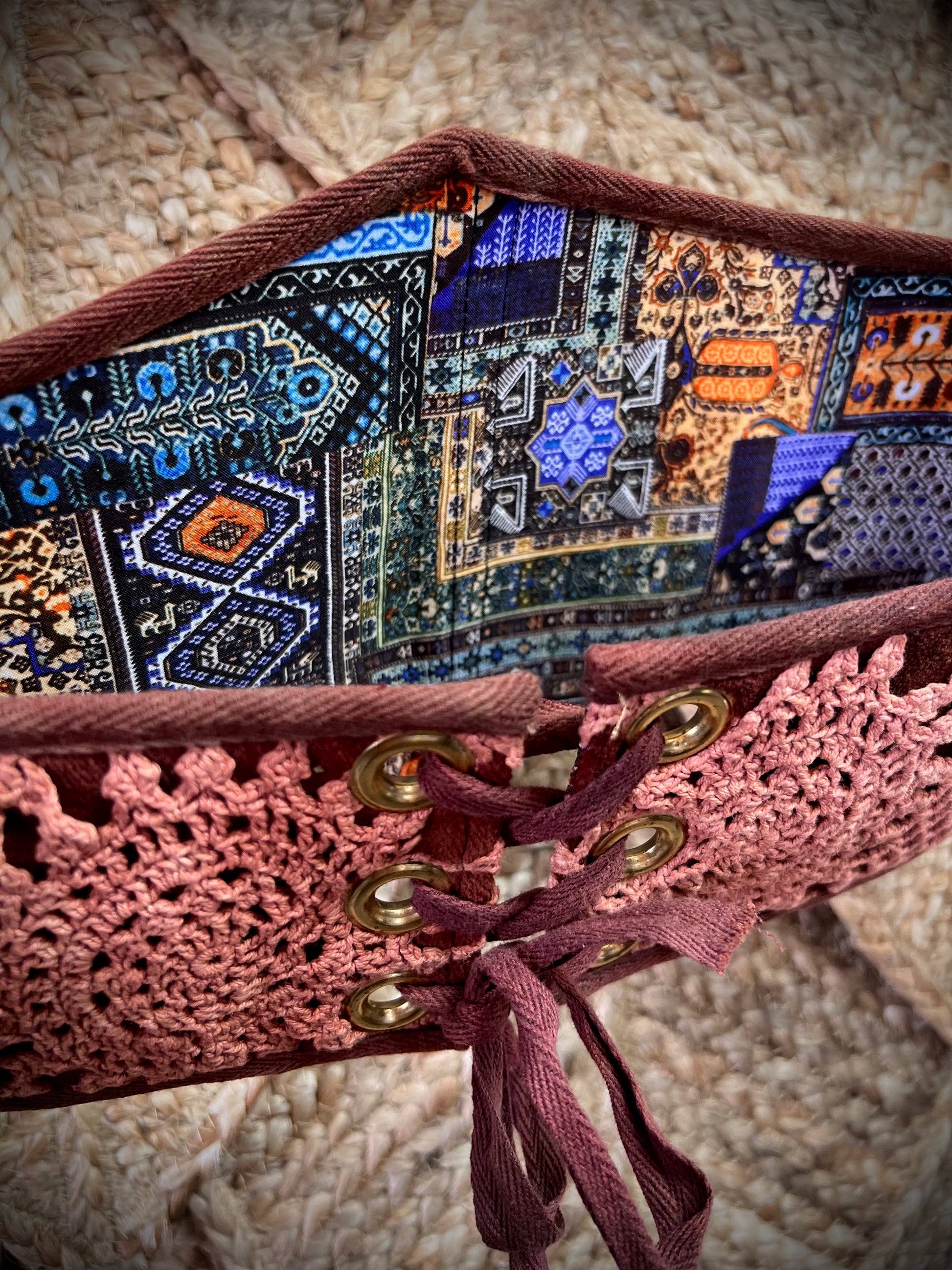 Hand Dyed Bamboo Velour Corset Belt with deathshead moth embroidery, metallic copper thread, complimentary vintage fabric lining & vintage doilie details. Features industrial eyelets, cotton cord tie & internal boning.