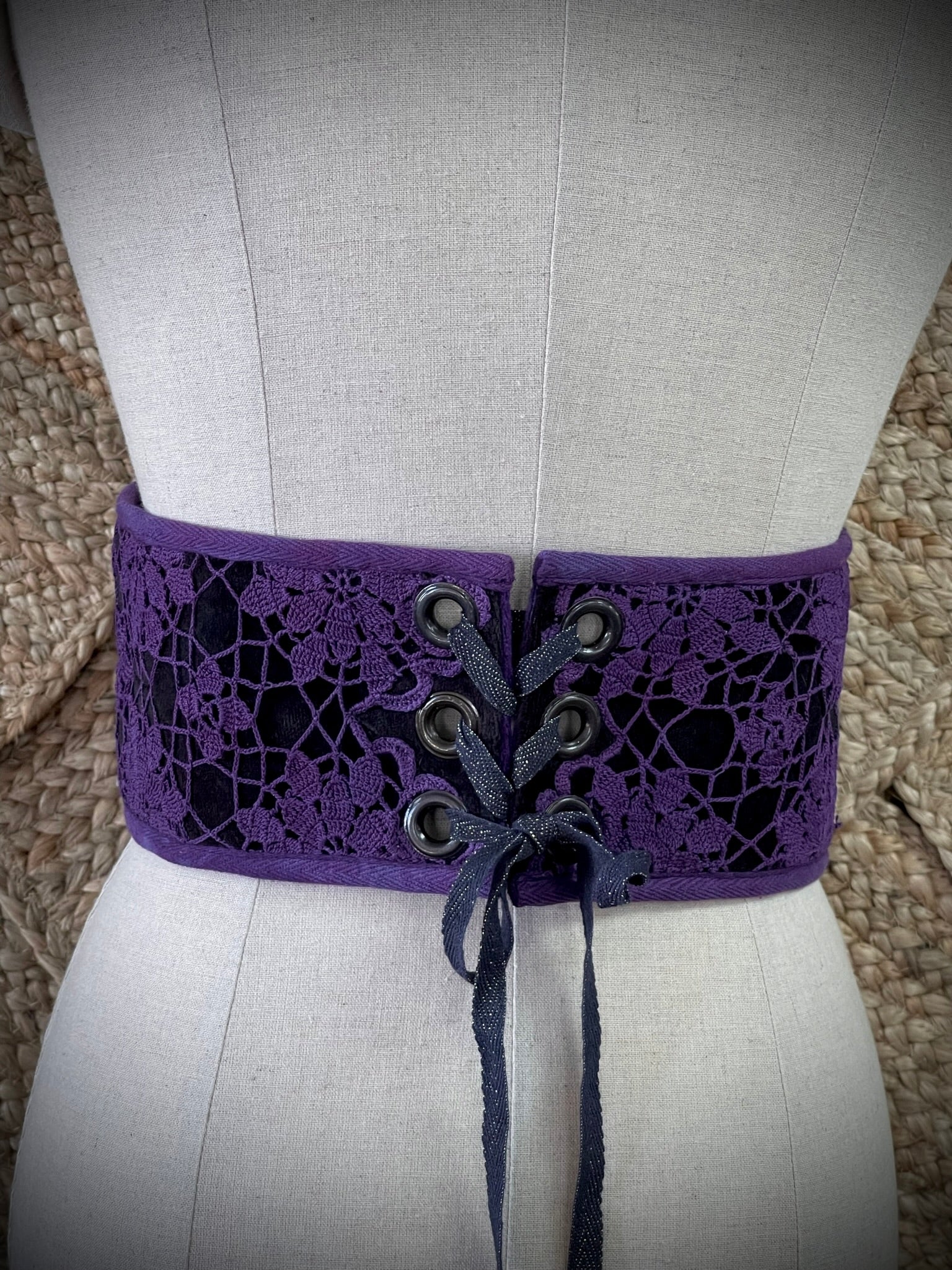 Hand Dyed Bamboo Velour Corset Belt with vintage doilie details & embroidered moon moth. Features industrial eyelets, cotton cord tie & internal boning.