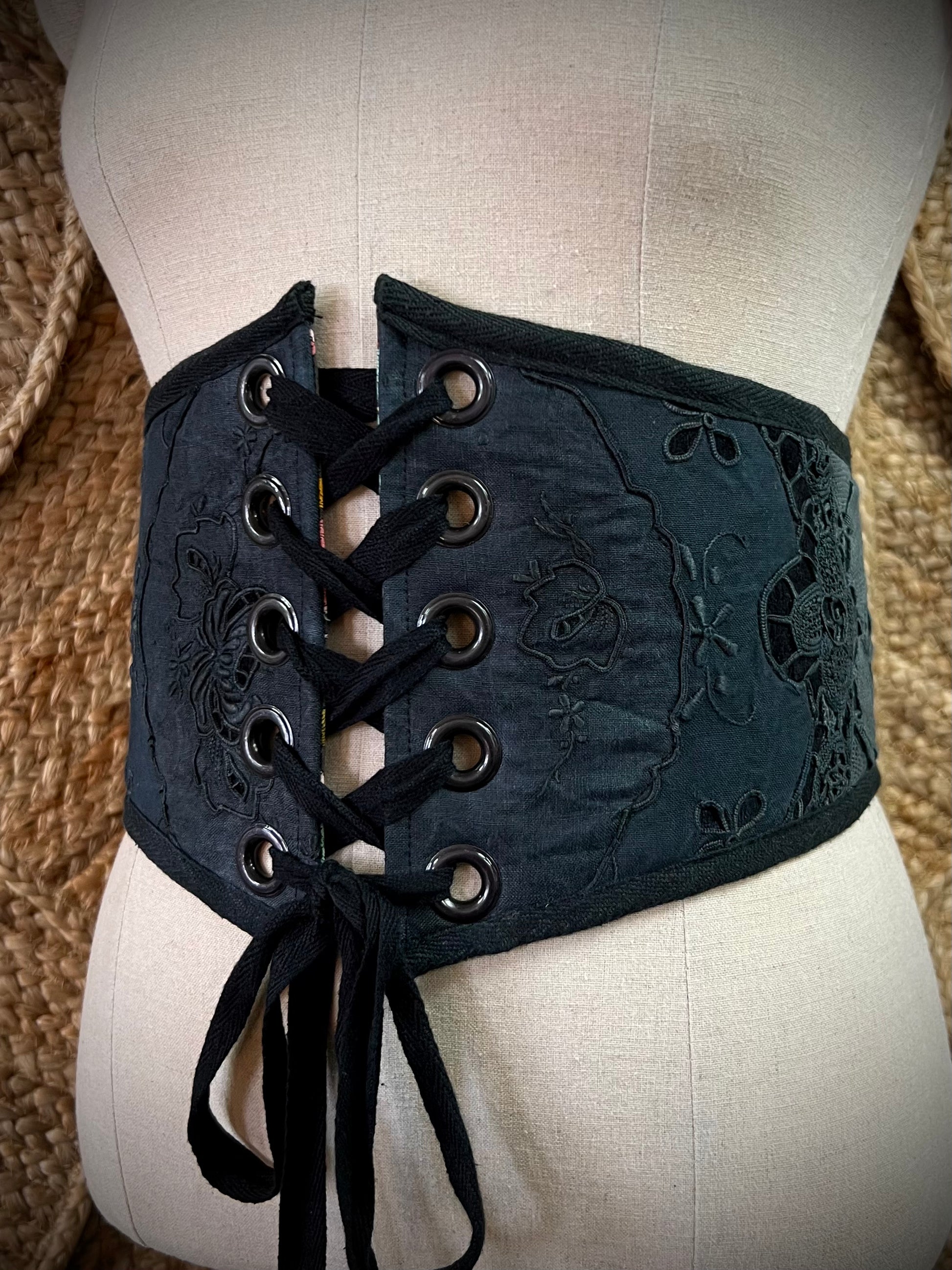 Hand Dyed Bamboo Velour Corset Belt with vintage doilie details. Features industrial eyelets, cotton cord tie & internal boning.