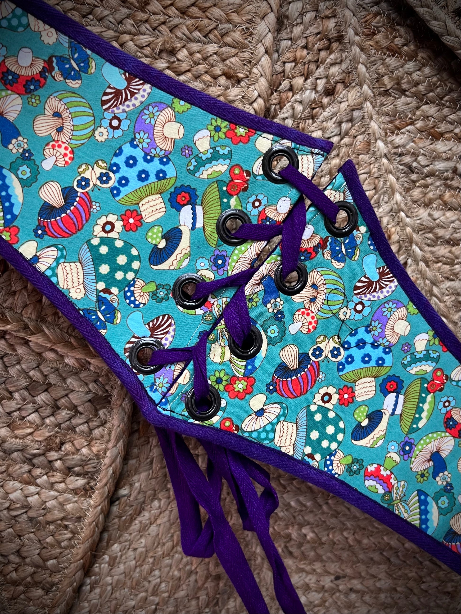 Hand Dyed Bamboo Velour Corset Belt with vintage doilie details. Features industrial eyelets, cotton cord tie & internal boning.