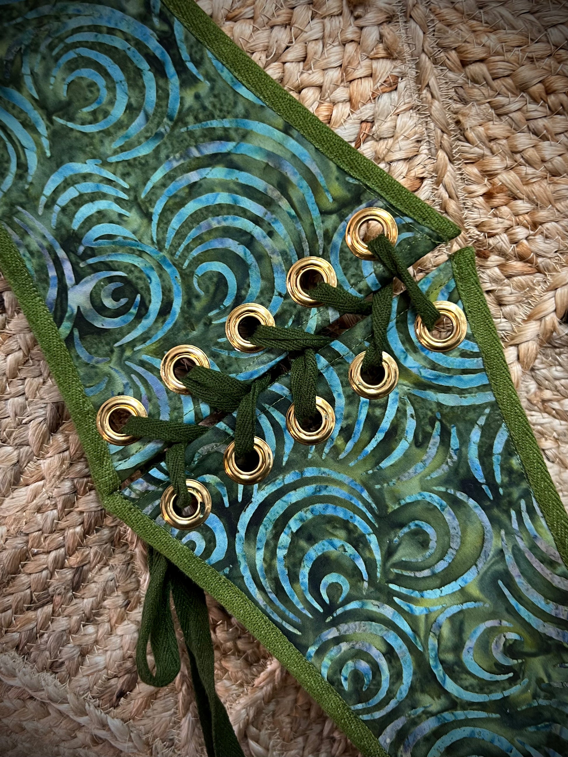 Hand Dyed Bamboo Velour Corset Belt with vintage doilie details. Features industrial eyelets, cotton cord tie & internal boning.