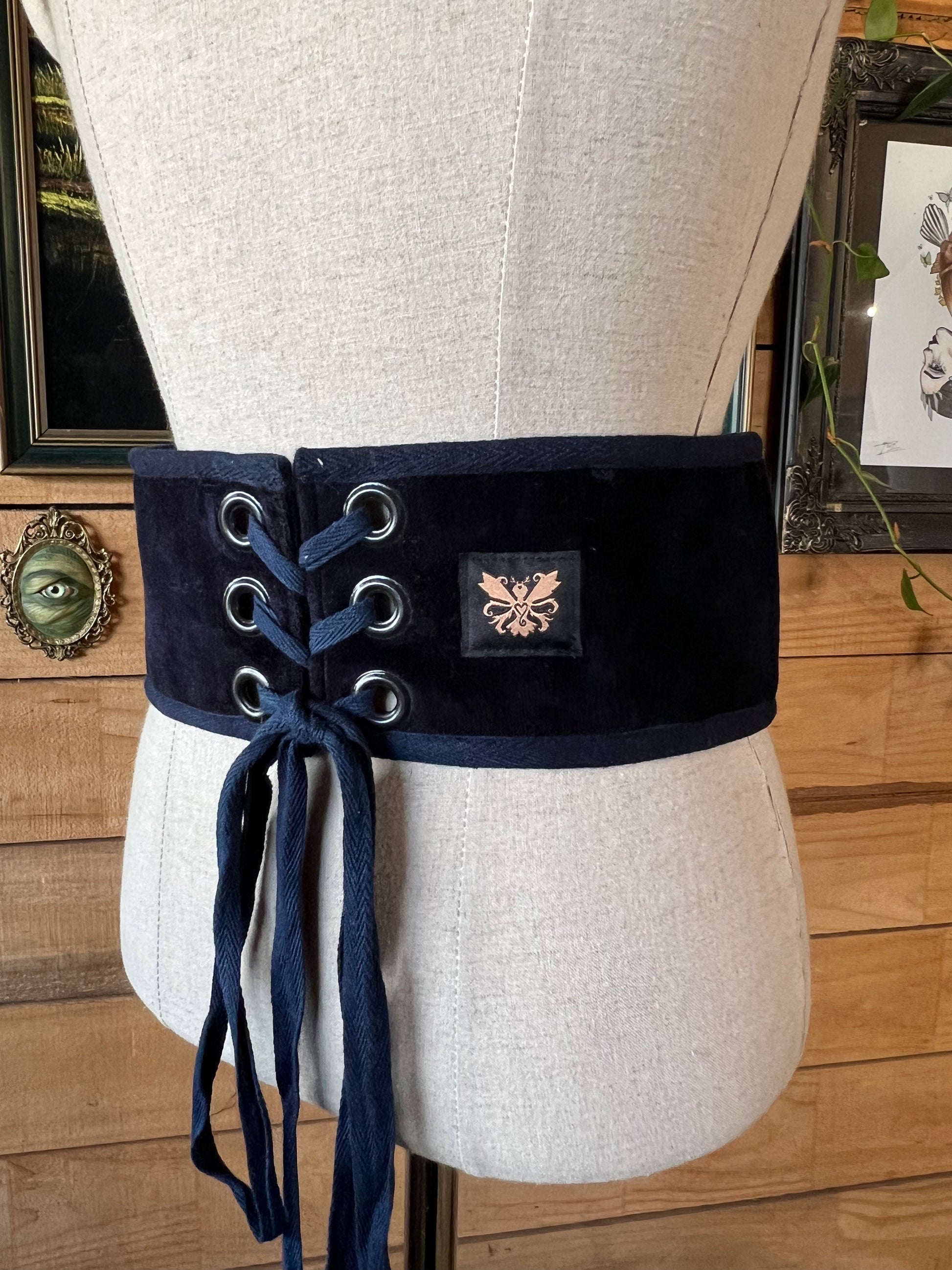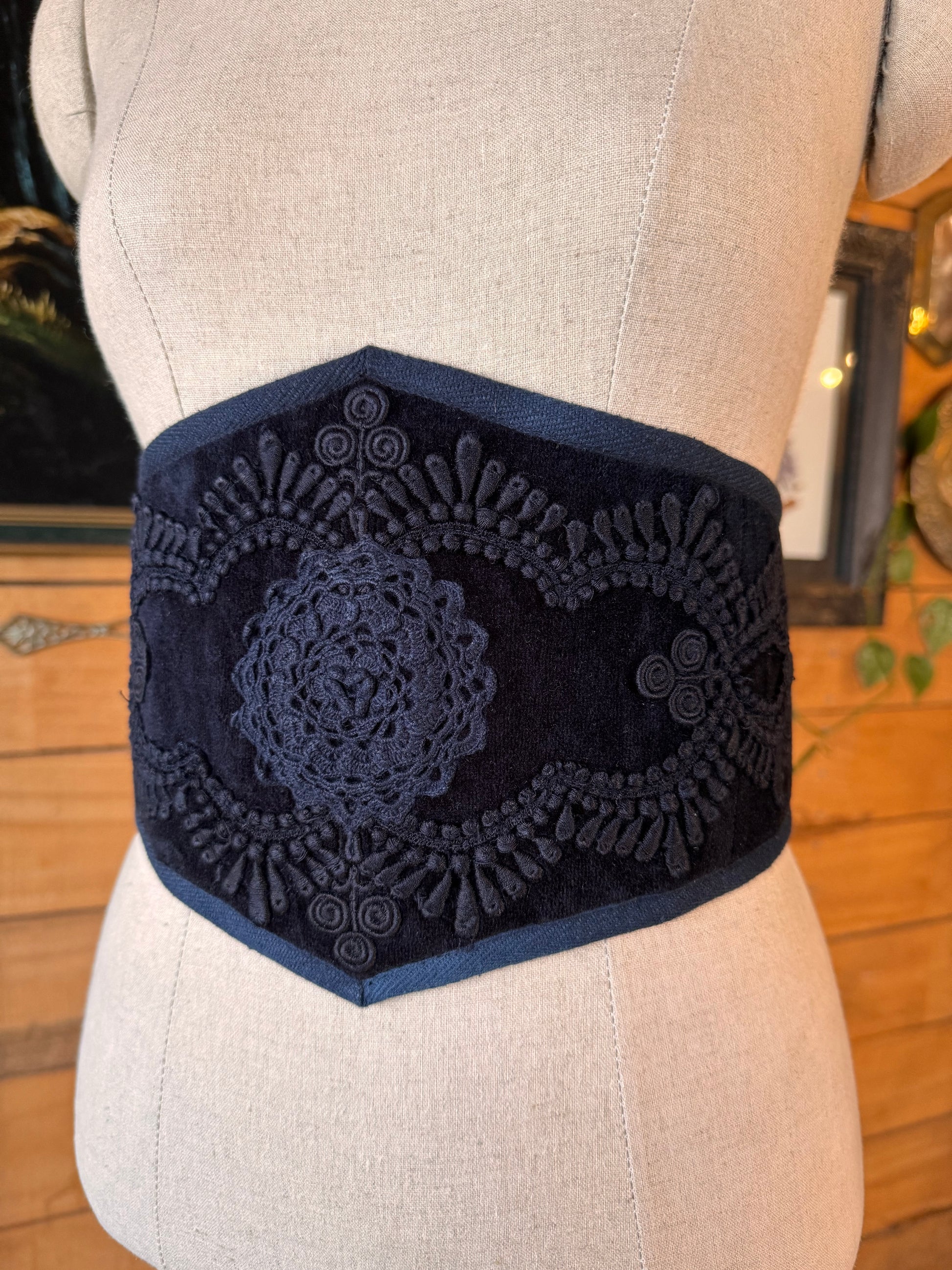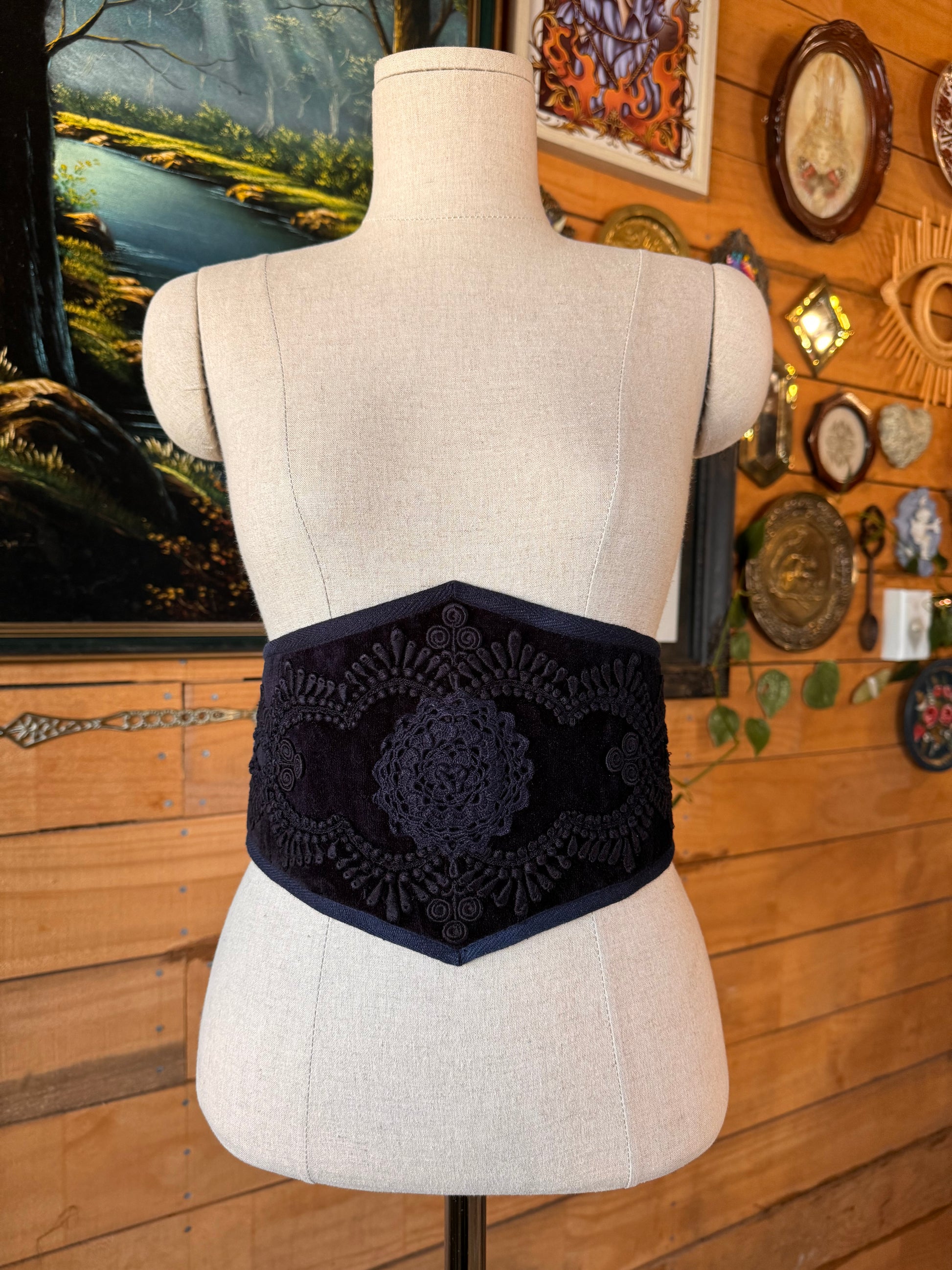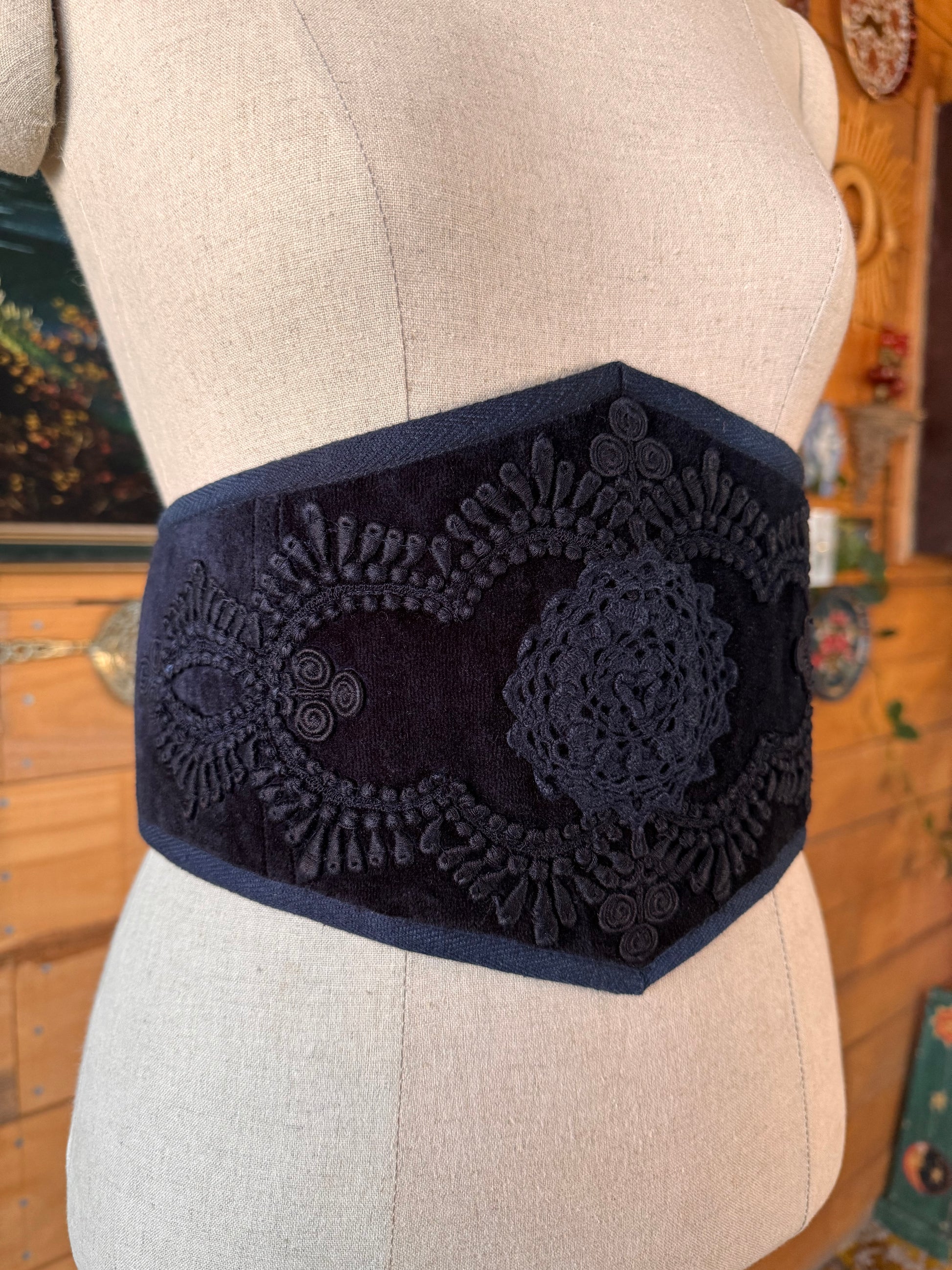 Hand Dyed Bamboo Velour Corset Belt with vintage doilie details. Features industrial eyelets, cotton cord tie & internal boning.
