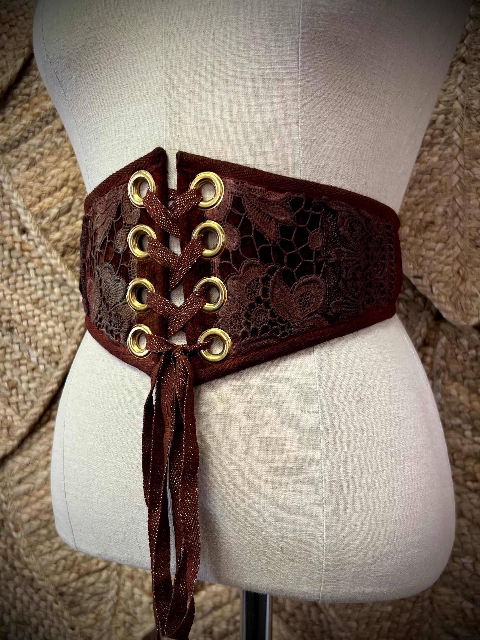 Hand Dyed Bamboo Velour Corset Belt with vintage doilie details. Features industrial eyelets, cotton cord tie & internal boning.