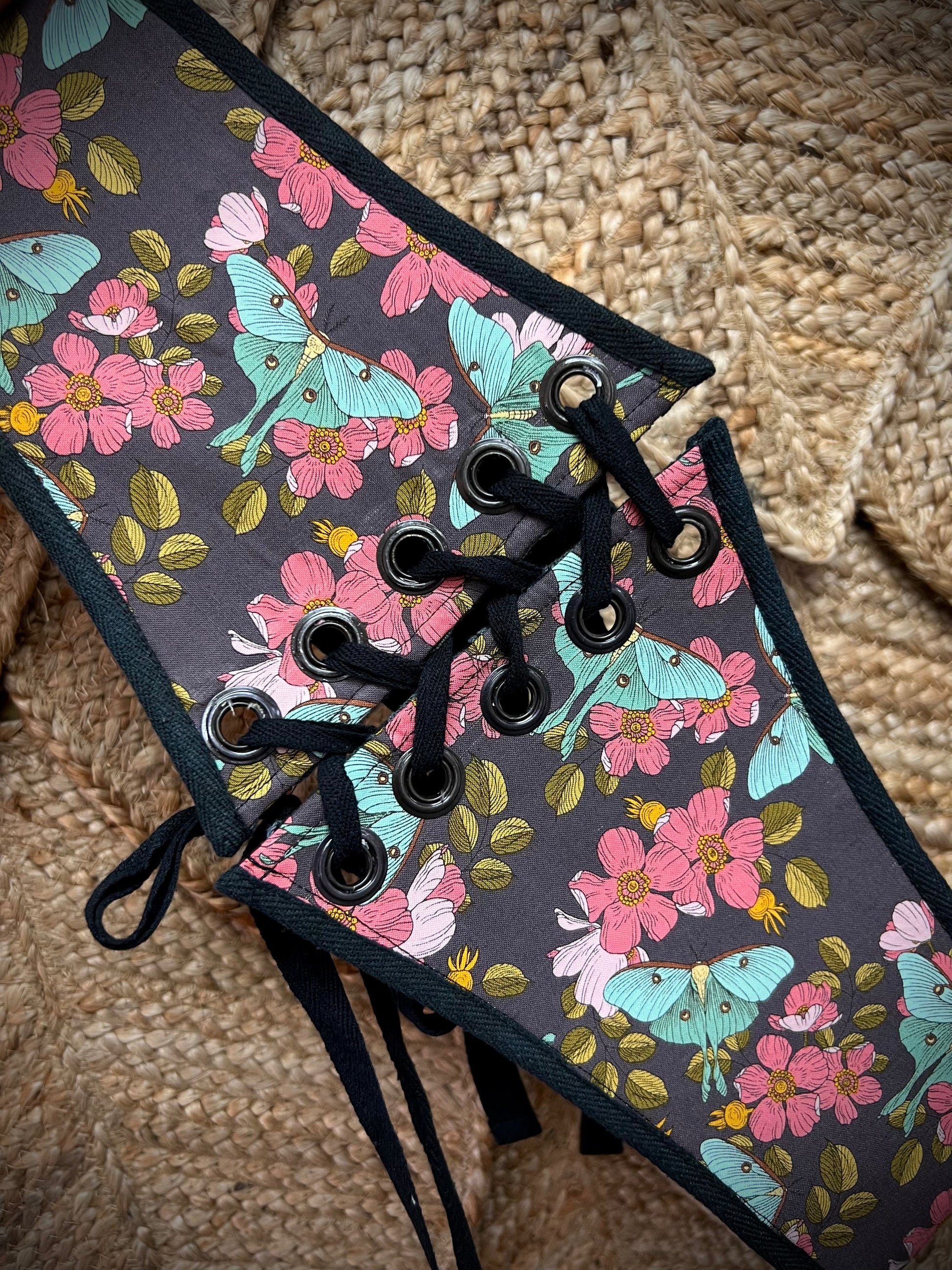 Hand Dyed Bamboo Velour Corset Belt with vintage doilie details. Features industrial eyelets, cotton cord tie & internal boning.